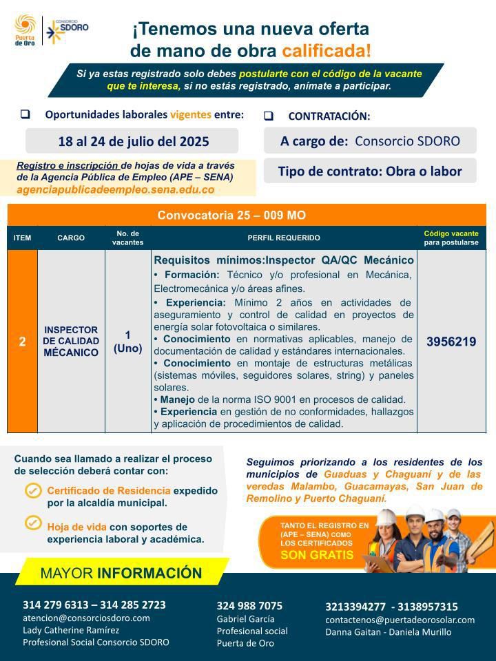 El Consorcio SDORO abre convocatoria para 1 vacante en el cargo de Inspector de Calidad Mecánico en el Parque Solar Puerta de Oro. Si cuentas con formación técnica o profesional en mecánica y experiencia en proyectos solares, esta oportunidad es para ti.