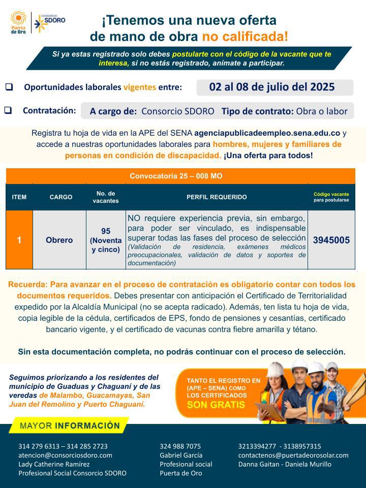El Parque Solar Puerta de Oro y el Consorcio SDORO abren 95 vacantes para obreros, sin experiencia previa. Priorizaremos a hombres, mujeres y a familiares de personas en condición de discapacidad.